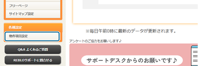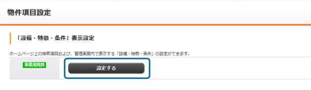 ホームページ上で設備条件を絞り込む際の項目や、管理画面上で使用する設備項目のデフォルト表示をカスタマイズする機能です。※ここで設定していない設備は、物件などの設備項目の選択肢として表示されません。