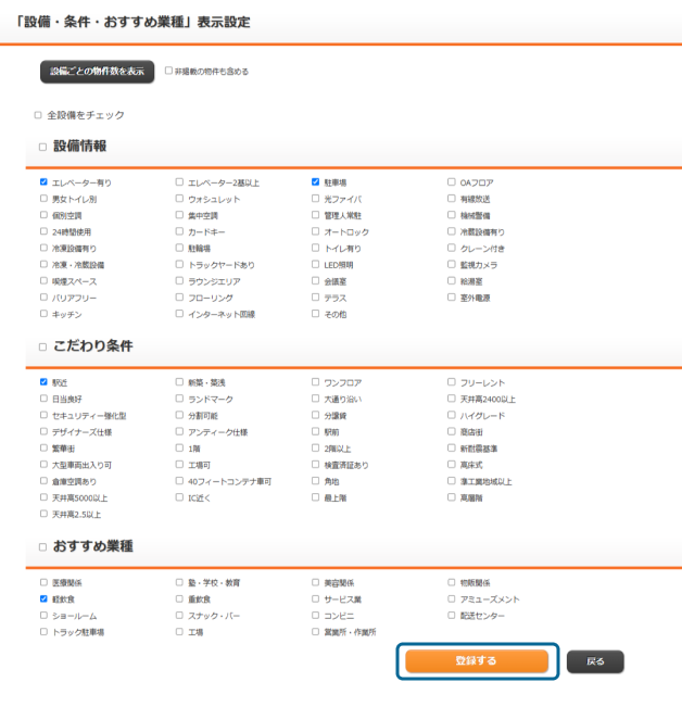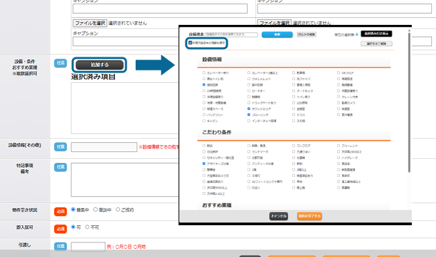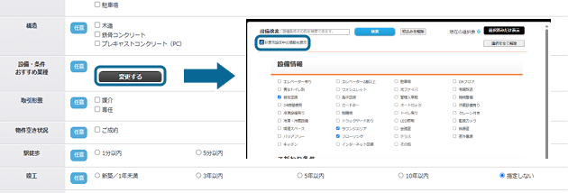 設備・条件の「変更する」をクリックすると、物件項目設定にてチェックを付けた項目がデフォルトで表示される。