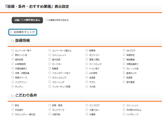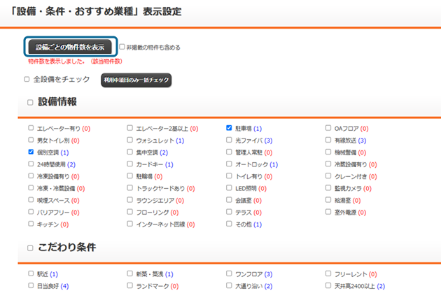 「設備ごとの物件数を表示」をクリックすると、設備名の横「(〇)」に該当物件数が表示される。