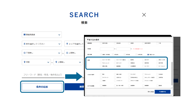 下部「条件の追加」をクリックすると、物件項目設定にてチェックを付けた項目が絞り込み項目として表示される。