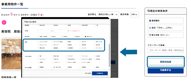 各物件一覧ページの右側にある「条件の追加」をクリックすると、物件項目設定にてチェックを付けた項目が絞り込み項目として表示される。